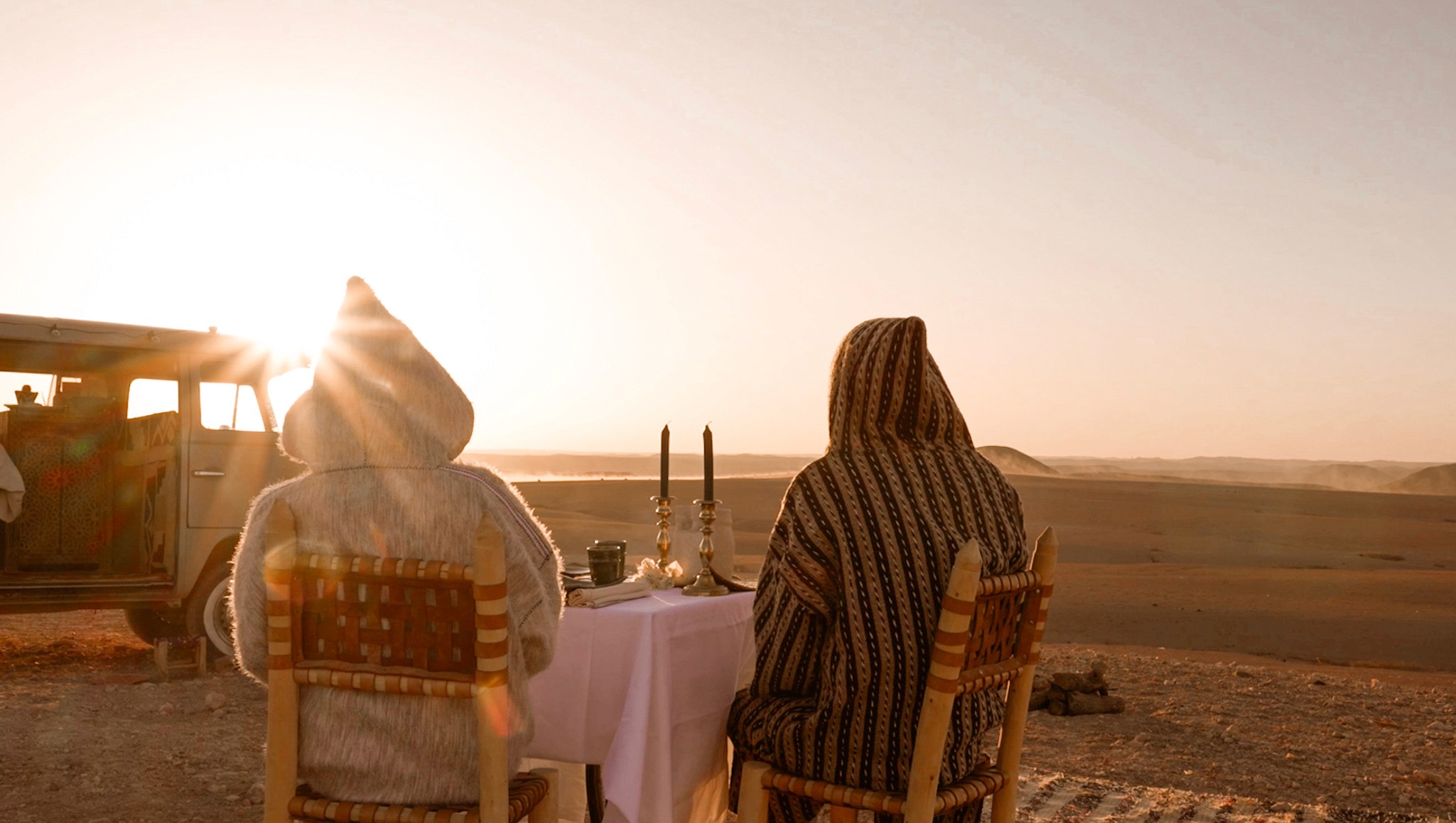 This experience invites you to spend the night inside a fully restored 1976 Volkswagen T2 — a rare vintage van transformed into a warm retro cocoon, set on a quiet hill overlooking the vast Agafay Desert and the Atlas Mountains.