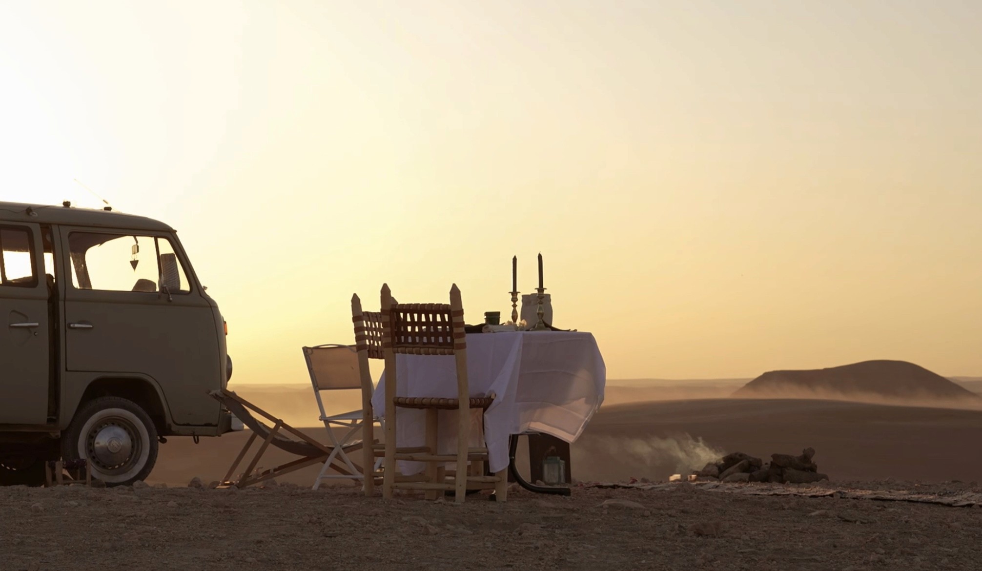 A private dinner is served beside your van: a white tablecloth, flickering candles, and a firepit under the open sky.